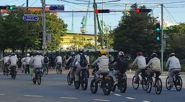 23일 이른 아침 출근시간에 맞춰 찾아간 경남의 한 조선소 정문은 예전과 다름 없이 분주한 모습이었다. 매일 2만5000명을 웃도는 노동자들이 생산현장으로 출근한다. 2010년대 중반부터 수년간 극심한 침체기를 겪은 이후 다른 도시에서 장거리를 출퇴근하는 노동자를 실어나르는 통근버스는 많이 줄어들었다.
