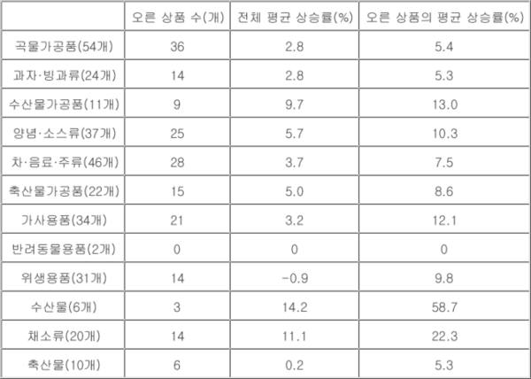 수산물과 채소류 이외 품목을 보면 조미김을 비롯한 수산물가공품 가격이 평균 9.7% 올랐고 양념·소스류 5.7%, 축산물가공품 5.0%, 차·음료·주류 3.7%, 가사용품 3.2% 등의 평균 상승률을 기록했다. 시리얼·라면을 포함한 곡물 가공품과 과자·빙과류는 각각 2.8% 올랐다.
