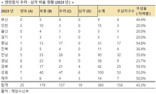 국회 농림축산식품해양수산위원회 소속 정희용 국민의힘 의원이 8일 해양수산부로부터 제출받은 국정감사 자료에 따르면 2023년도 전국 360개소의 연안침식 실태조사 결과 연안침식 우려심각지구수는 156개소로 집계됐다. 우려심각비율은 약 43.3%로 나타났다.
