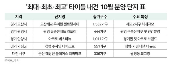 10월 분양시장에서 '최대·최초·최고' 타이틀을 내건 아파트의 분양이 잇따라 이목이 쏠린다. 이들 단지는 상징성과 희소성을 바탕으로 수요자들에게 관심이 집중되고, 향후 랜드마크 기대감, 차별화된 상품성 등에 호응이 높아 흥행 성적을 이어가고 있는 만큼, 많은 관심이 이어질 전망이다.