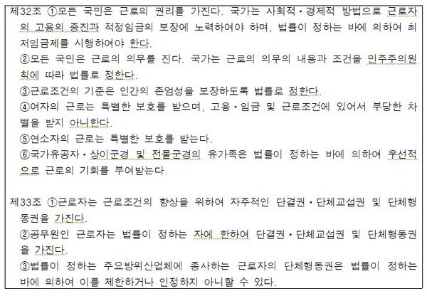 본래 대한민국 사회는 본태적으로 유한계급과 지배계급을 타파하고 있기에(헌법 전문에서 ‘모든 사회적 폐습과 불의를 타파하고’라고 정함), 사회 전반에 걸쳐 근로(노동)의 권리는 개별적 근로관계법상으로나 집단적 노동관계법으로나 권익이 신장하고 있고 그 보호의 정도가 확고해져 가고 있다. 그렇기에 헌법은 2개의 조문을 들여서 근로의 권리에 관하여 다음과 같이 상세하게 정한다.