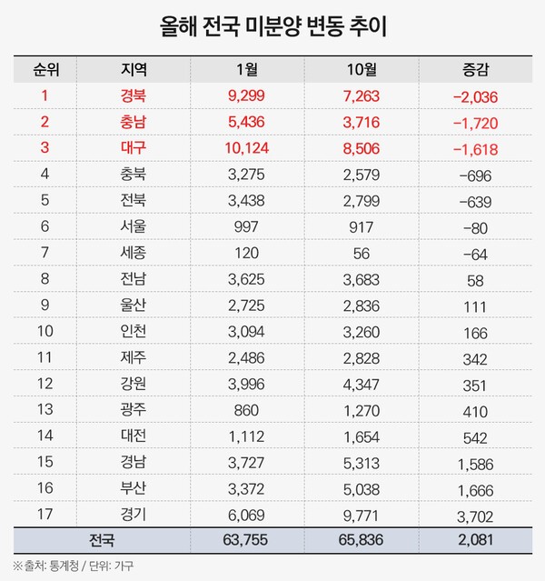 그러나 이 중에서도 경북과 충남, 대구 지역은 오히려 미분양이 감소한 것으로 나타났다. 경북은 올해 1월 미분양 규모가 9299가구에서 10월 7263가구로 2036가구 감소했고, 대전도 같은 기간 5436가구에서 3716가구로 줄어 들었다. 대구 역시 1월 1만 124가구에서 10월 8506가구로 10개월 새 1618가구 감소했다.
