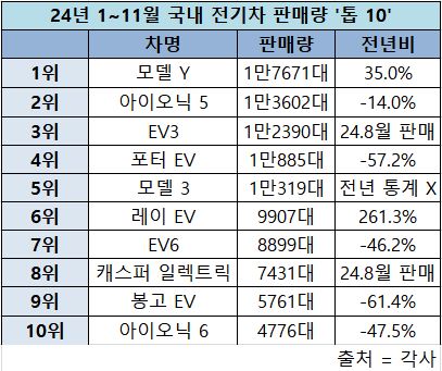 1위는 1만7671대를 판매한 테슬라의 '모델 Y'가 차지했으며, 현대차 '아이오닉 5'는 1만3602대를 팔아 2위를 차지했다.
