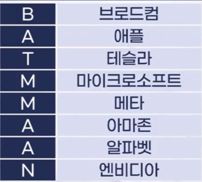 배트맨은 미국 월스트리트 투자은행에서 올해 주가가 폭등한 시가총액 1조달러 이상 기업 8곳의 앞글자를 따 만든 단어다.