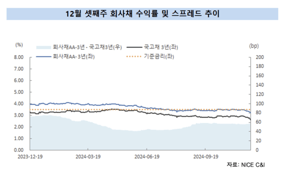 크레딧 시장에선 미국의 기준금리 인하속도 조절로 금리 인하 수혜가 사라진 부동산신탁사들의 신용등급 줄 강등이 이어졌다. 12월(셋째주 기준) 회사채 발행 규모는 2조 5296억원으로 전월 같은 기간 5조 1973억원 대비 절반 가량 감소했다.