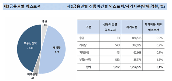 그러나 S&P의 지적과 달리, 신동아건설 법정관리에 따른 제2금융권 익스포져는 미미한 것으로 파악됐다. 총 1202억원 수준으로, 가장 많이 노출된 곳은 캐피탈사(573억원)였으며, 부동산신탁(533억원), 증권(53억원), 저축은행(43억원) 순이었다.