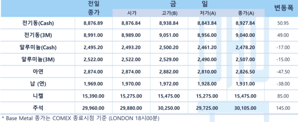 관련기사 [LME] 비철가격 상승…전기동 8877달러 [LME] 비철가격 상승…전기동 8860달러 [LME] 비철가격 혼조…전기동 8687달러 [LME] 비철가격 혼조…전기동 8816달러 [LME] 비철가격 혼조…전기동 8810달러 [LME] 비철 가격 혼조…전기동 8988달러 [LME] 비철 가격 상승…전기동 9042달러 [LME] 비철금속 가격 혼조…전기동 9092달러 [LME] 비철 금속 가격 상승…전기동 8994달러 [LME] 비철금속 가격 혼조…전기동 8983달러