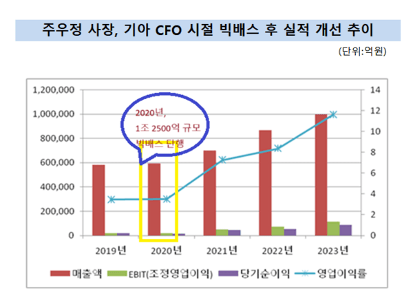 주우정 사장은 현대차그룹 대표적 재무전문가로, 기아 CFO 역임 시절에도 강도 높은 빅배스 단행 이후 본격적인 실적 개선 전략을 통해 기아의 사상 최대 실적을 이끌어낸 바 있다. 당시 주 신임 사장은 2019년 기아 CFO에 오른 후, 1년 만인 2020년 1조 2500억원에 이르는 품질비용을 실적에 반영하는 빅배스를 단행했다. 갑작스런 조 단위 손실처리에 기아 노조는 물론 주식 시장과 국내외 신용평가사들까지 기아의 '밀어내기식' 재무 전략을 비판했다.