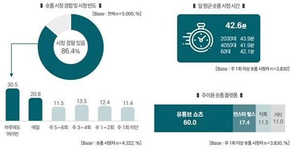 이번 설문에서 응답자 86.4%가 '숏폼 시청 경험이 있다'고 답했으며 이중 '하루에도 여러 번 본다'(30.5%)와 '매일 본다'(20.8%)고 답한 응답자는 절반을 넘었다.