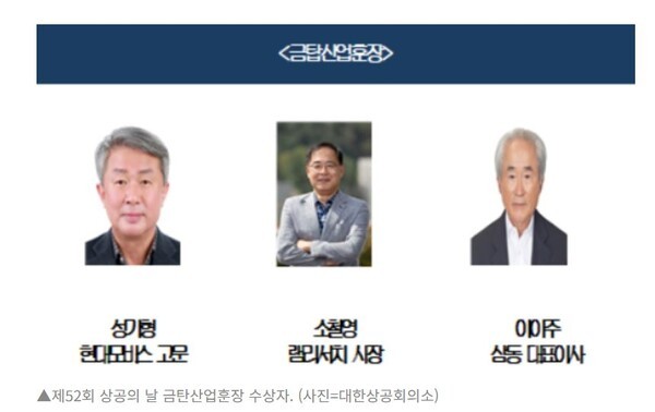 성기형 현대모비스 고문·소철영 램리서치매뉴팩춰링코리아 사장·이이주 삼동 대표이사가 '상공의 날' 기념식에서 최고 영예인 금탑산업훈장을 받았다.