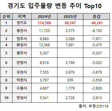 부동산R114 자료에 따르면, 올해 경기도 내 입주 예정 물량은 6만 8,347가구로, 전년(11만 4,588가구) 대비 약 40.4%(4만 6,241가구) 감소했다. 이는 전국에서 가장 큰 감소폭이다. 같은 기간 인천은 23.9%(2만 9,740가구→2만 2,638가구) 줄었고, 서울은 오히려 34.5%(2만 8,074가구→3만 7,747가구) 증가한 것으로 나타났다.