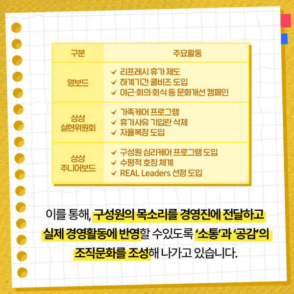 각 협의체는 리프레시 휴가 제도, 자유복장 도입, 심리케어 프로그램 등 구성원의 삶의 질 향상을 위한 제도 개선을 이끌어냈다.
