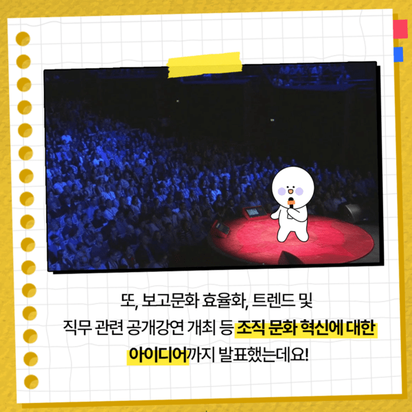또한 보고문화의 효율화, 직무 관련 트렌드 및 강연 개최 등 실질적이고 실행 가능한 혁신 아이디어를 발표하기도 했다.