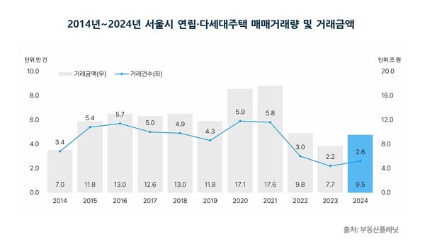 부동산 빅데이터 및 AI 기반 프롭테크 기업 부동산플래닛이 27일 발표한 ‘2024년 연간 서울시 연립·다세대주택 매매 및 전·월세시장 동향’ 보고서에 따르면 매매거래량은 2만6214건으로 전년(2만1736건) 대비 20.6% 증가했다. 거래금액 역시 7조7154억 원에서 9조4711억 원으로 22.8% 늘어나며 3년 만에 상승세로 돌아섰다.