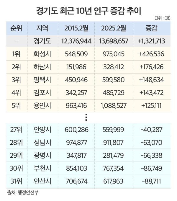 행정안전부 주민등록 인구 통계에 따르면 최근 10년간 경기도 내 인구 증가 폭이 가장 컸던 지역은 ▲화성(42.6만명↑) ▲하남(17.6만명↑) ▲평택(14.8만명↑) ▲김포(14.3만명↑) 그리고 ▲용인(12.5만명↑) 순으로 나타났다. 이들 지역은 대체로 산업단지 조성과 대규모 택지 개발이 병행된 곳들로, 도시 외연이 빠르게 확장되면서 주거 수요도 크게 증가한 공통점이 있다. 특히 화성, 평택, 용인은 반도체 산업단지와의 연계성이 뚜렷한 지역으로, 산업을 기반으로 한 성장 동력이 인구 증가로 이어지는 구조를 보여준다.