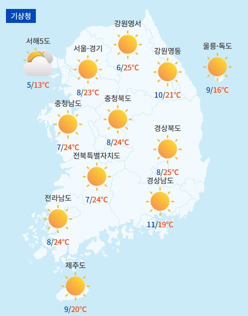 최고기온은 ▲서울 24도 ▲인천 19도 ▲수원 23도 ▲춘천 25도 ▲강릉 21도 ▲청주 25도 ▲대전 25도 ▲전주 24도 ▲광주 24도 ▲대구 25도 ▲부산 19도 ▲울산 21도 ▲제주 21도이다.