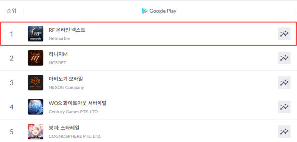 넷마블의 신작 다중접속역할수행게임(MMORPG) 'RF 온라인 넥스트'가 첫 번째 대규모 업데이트 직후 구글 플레이스토어 매출 순위 1위를 탈환했다.