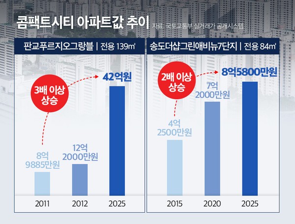 실제 판교신도시는 콤팩트시티의 대표 사례로 꼽힌다. 넥슨, 카카오, 안랩 등 IT·소프트웨어 기업과 스마일게이트, 네오위즈, 에이텍 등 첨단산업 기업이 입주하며 부동산 가격도 급등했다. 국토교통부 실거래가에 따르면 ‘판교푸르지오그랑블’ 전용 139㎡는 2011년 입주 당시 8억9885만원에서 1년 뒤 12억2000만원으로 상승했고, 올해 3월에는 42억원에 거래되며 3배 이상 올랐다.