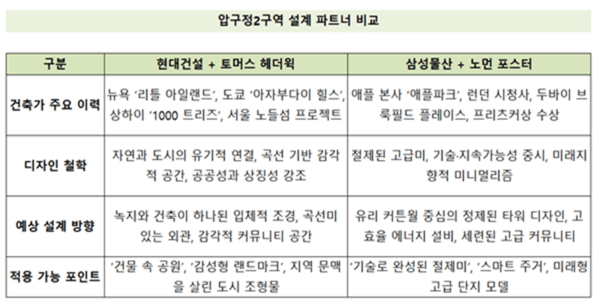 업계 관계자는 "헤더윅과 포스터의 대결은 글로벌 건축 철학의 대조이자, 도시 공간에 대한 미래 상상을 압구정이라는 상징적 무대에 펼치는 일"이라며 "압구정2구역은 향후 재건축 시장의 기준을 넘어 도시 고급 주거의 새로운 정의를 내릴 것"이라고 평가했다.