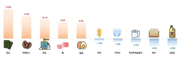 전년 동기 대비 가격 상승률이 가장 높았던 품목은 맛김으로, 15.8% 올랐다. 이어 커피믹스(12.0%), 분유(10.1%), 햄(8.6%), 달걀(8.3%) 순으로 나타났으며, 이들 상위 5개 품목의 평균 상승률은 11.0%에 달했다.