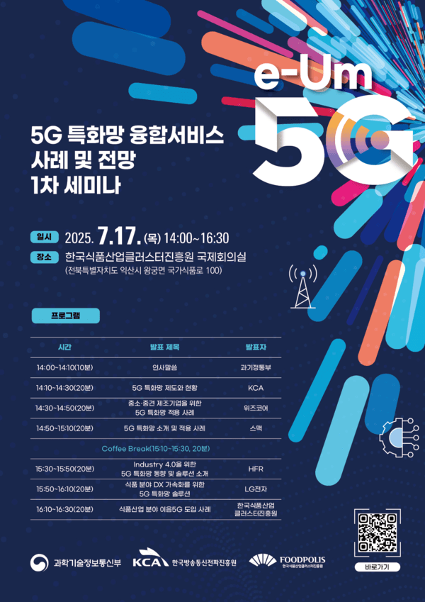 17일 전북 익산 한국식품산업클러스터진흥원에서 개최된 1차 세미나는 LG전자, 에치에프알, 스맥, 위즈코어 등 특화망 장비 및 서비스 기업들이 참여해 식품 산업 분야에서의 5G 특화망 적용 사례를 소개했다.