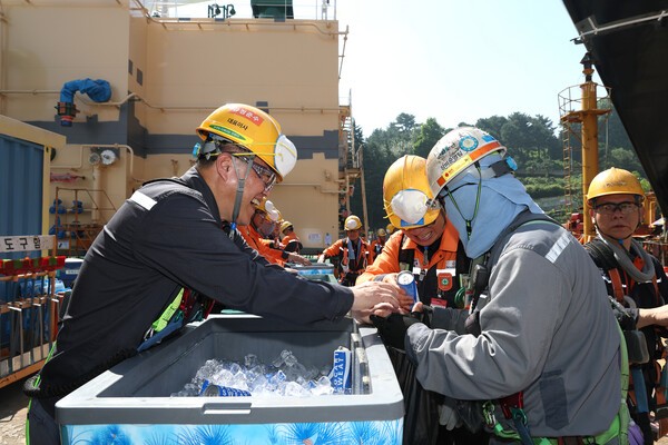 ![한화오션 김희철 대표이사(왼쪽)가 거제사업장 1도크 주변에서 근로자들에게 시원한 음료를 건네주고 있다.[출처=한화오션 ]](https://cdn.ebn.co.kr/news/photo/202509/1679163_696233_360.jpg)
