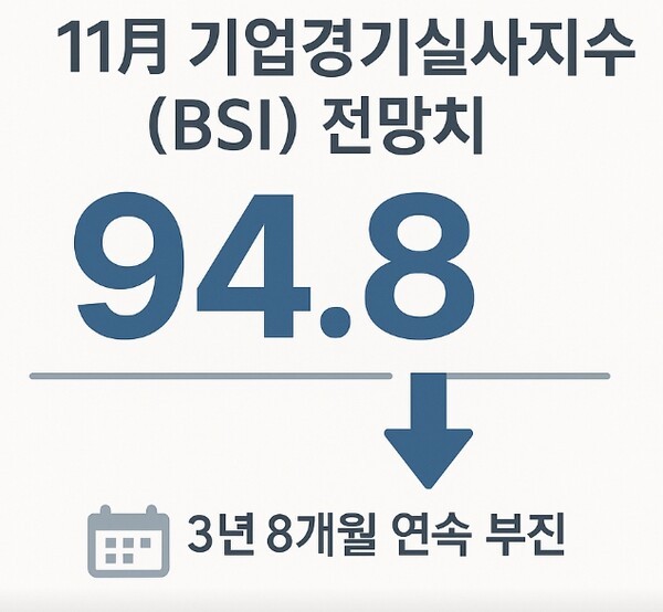 28일 한국경제인협회 조사에 따르면 11월 기업경기실사지수(BSI) 전망치는 94.8로, 기준선 100을 밑돌며 3년 8개월 연속 부진을 이어갔다.