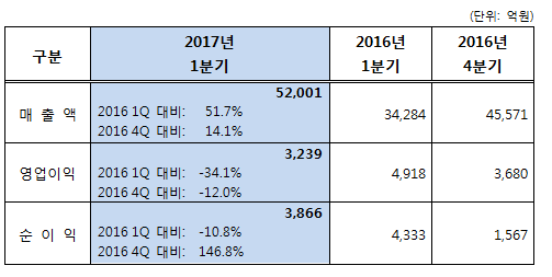 에쓰오일은 판매물량 증대와 유가 상승으로 인한 제품 판매단가 상승(전분기 대비 11.6%)에 힘입어 전분기 대비 14.1% 증가한 5조2000억원의 매출을 기록했다. 영업이익은 환율하락 영향으로 전년 동기 대비 34.1% 감소했다.