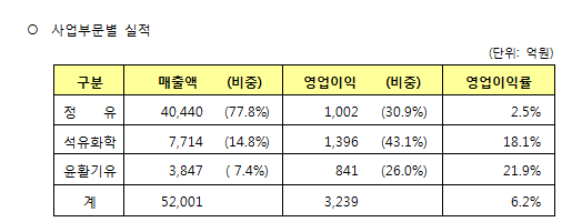 석유화학·윤활기유 사업에서 전체 영업이익 중 69.1%를 합작해 6.2%의 양호한 영업이익률을 달성했다.