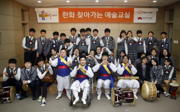 한화그룹에 따르면 장애인의 날(20일)을 맞아 지난 19일 충북 세종시 금호중학교에서 장애청년 국악연주단 '땀띠'의 사물놀이 공연을 후원했다.