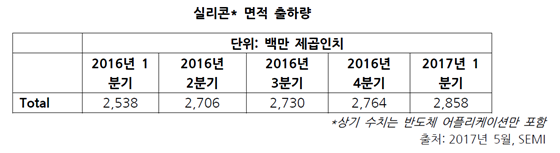 2017년 1분기 실리콘 면적 출하량은 총 28억5800만제곱인치로, 지난해 4분기 27억6400만 제곱인치에 비해 3.4% 상승했다.