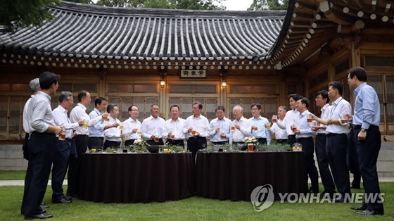 문재인 대통령과 기업인들이 27일 청와대 상춘재에서 일자리 창출과 상생협력을 주제로 대화를 나눴다. '주요 기업인과의 호프미팅'으로 불린 이날 회동은 노타이 정장 차림으로 격의없는 대화의 시간을 가졌다.
