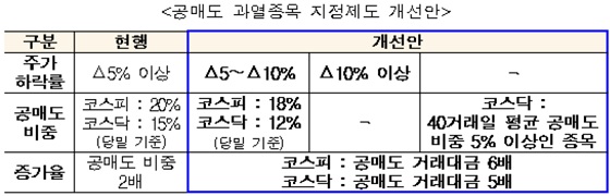 이번 제도 개선을 통해 공매도 과열종목의 적출 기준을 대폭 확대한다. 상승장에서도 과열종목이 적출될 수 있도록 코스피는 공매도 비중 요건을 기존 20%에서 18%로 낮추고 코스닥은 기존 15%에서 12%으로 인하한다.