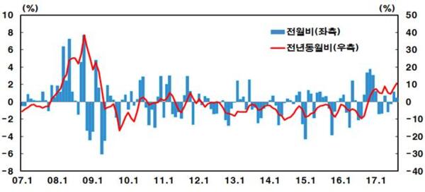 이는 한달 전보다 0.5% 증가한 규모로, 원달러환율은 하락했으나 석탄 및 석유제품, 제1차금속제품 등이 오른 결과다.