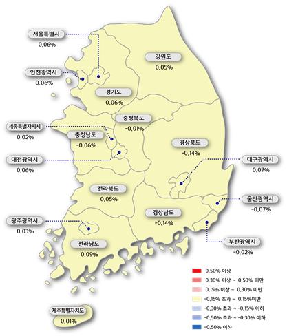 시도별로는 전남(0.09%), 대구(0.07%), 서울(0.06%) 등은 상승했고, 경북(-0.14%), 경남(-0.14%), 울산(-0.07%), 충남(-0.06%) 등은 하락했다.