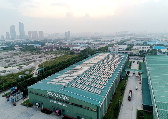 30일 포스코에 따르면 최근 중국 쑤저우(蘇州)에 위치한 중국통합가공법인(POSCO-CSPC)이 포스맥으로 제작한 태양광 발전설비를 1공장 옥상에 설치했다.