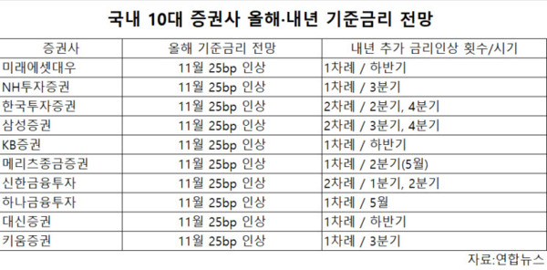 내년에 한은이 추가로 금리를 인상할 것이라는 데에도 10개 증권사 중 다른 의견은 없었다.