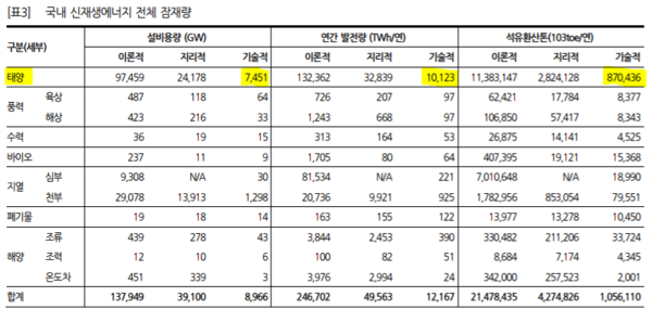 한화리서치에 따르면 우리나라는 약 138TW급의 신재생에너지 이론적 잠재량을 보유하고 있고, 현재 우리나라에서 기술적으로 건설 가능한 신재생에너지 발전 잠재량은 8966GW로 예상된다. 이 중 태양광 발전과 태양열 발전에 공급되는 태양에너지는 전체의 83%인 7451GW에 달한다.