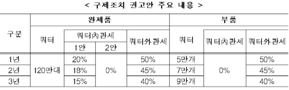 특히 1안(표 참조)이 수용돼 20%의 쿼터 내 추가관세가 부과될 경우 우리 기업의 대미(對美) 수출에 큰 타격이 될 것으로 판단했다.
