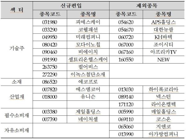 APS홀딩스, 대한뉴팜, KH바텍, 조이시티, 아프리카TV, NEW, 하이록코리아, 넥스턴, 라이온켐텍, 매일홀딩스, 코스온, 지엔코, 아가방컴퍼니 등 13종목은 제외됐다.