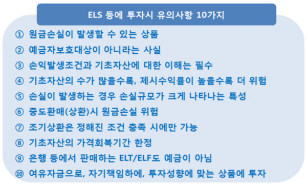금감원 관계자는 “파생상품 투자에 있어 막연히 자신이 투자하는 동안 큰 폭의 주가지수 등의 하락이 없을 것이라고 단정하고 투자하는 것은 피해야 한다”면서 “원금손실이 발생할 수 있는 금융투자상품이라는 점을 정확히 알고 자기책임으로 투자할 필요가 있다”고 강조했다.