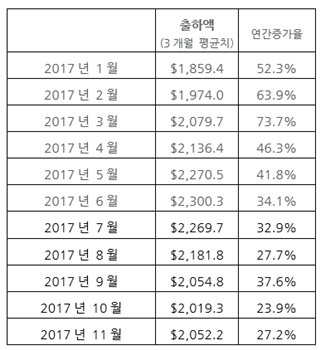 SEMI는 북미지역 반도체 장비제조사들의 출하액 3개월 평균치를 보고서로 작성하고 있다. 11월 출하액은 지난달 10우러 출하액 대비 1.6% 상승했으며 전년도 동기 대비로는 27.2% 증가했다.