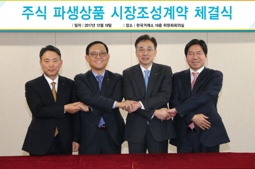 한국거래소는 19일 삼성증권·한화투자증권·이베스트투자증권과 주식 파생상품 시장조성계약을 체결했다.