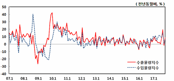 26일 한국은행이 발표한 '2017년 11월 무역지수 및 교역조건'에 따르면 지난달 수출물량지수는 155.31(2010=100)로 전년 동월 대비 8.7% 상승했다. 이는 지난 9월(162.35) 이후 최대치다.