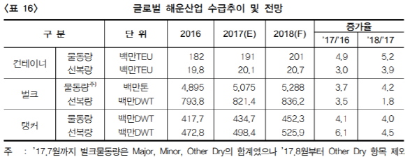 산업은행은 "2017년 원자재 교역량 확대로 운임이 상승한 컨테이너선과 벌크선은 업황이 점차 회복되고 있다"며 "VLCC의 공급이 확대되고 있는 탱커선은 업황부진이 이어질 것"이라고 예상했다.
