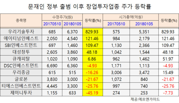 8일 에프앤가이드는 문재인 정부 출범 이후 현재까지 상장된 창업투자업종의 주가 등락률을 집계했다. 그 결과 우리기술투자가 685원에서 6370원으로 829% 가량 상승해 가장 큰 폭으로 뛰어올랐다. 우리기술투자는 가상화폐거래소를 개설한 두나무의 지분 7.65%를 보유중이다.