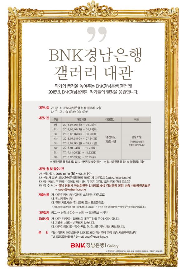 신청 방법은 BNK경남은행갤러리 홈페이지에서 대관신청서 양식을 다운로드 받아 작성한 후 전시계획서·전시도록·포트폴리오 등 관련 자료를 갖춰 이메일 또는 우편 접수하면 된다.