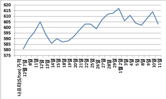 한편 1월 둘째주 싱가폴 거래 기준 나프타(naptha) 가격은 톤당 603.8달러를 보이며 전주대비 소폭 하락했다. 원유가 상승에도 불구하고 나프타의 역내 공급 증가 전망에 따른 영향을 받은 것으로 보인다. 글로벌 시장조사기관인 IHS에 의하면 1월 유럽산 나프타 1.9백만톤이 역내 공급될 예정이다.
