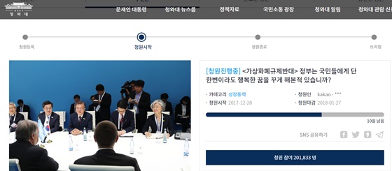 지난달 28일 시작된 이 청원은 가상화폐 열풍 속에 청원 마감일을 열흘이나 남겨 두고 20만명 이상의 참여를 이끌어냈다.