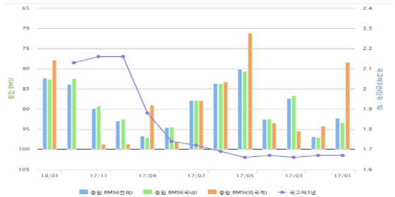 새해 들어 기준금리를 제외한 채권시장지표(BMSI, Bond Market Survey Index)가 하락세를 보인 것으로 나타났다.